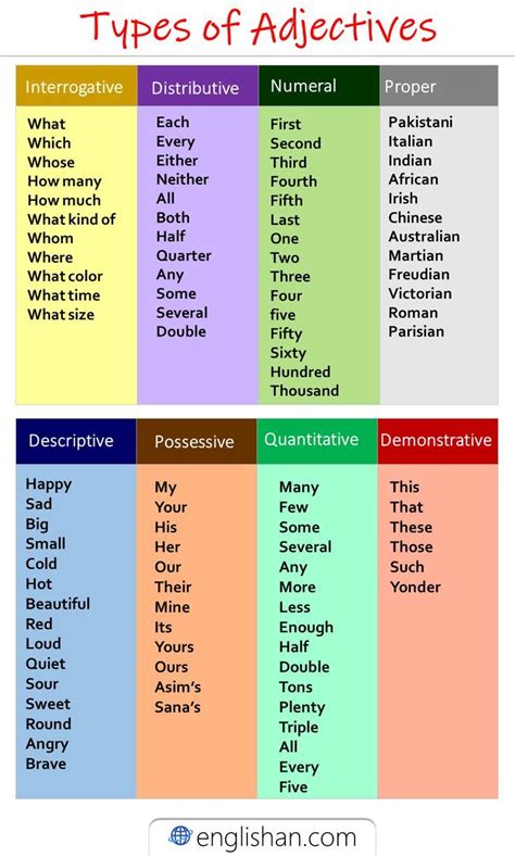 These are probably the most common type you’ll encounter, guys. Descriptive adjectives tell us about the quality or characteristic of a noun or pronoun. They answer the question “ What kind? ” Think of words that paint a picture in your mind. If you’re describing a beautiful sunset, the word beautiful is a descriptive adjective. If you’re talking about a tall building, tall is descriptive. These are your go-to words for adding sensory details and specific attributes. They can describe appearance, size, shape, color, texture, sound, taste, and more. The key is that they provide a qualitative description – they tell us what it’s like . Some examples include: happy , sad , big , small , round , square , blue , loud , sweet , rough , smooth , interesting , boring , expensive , cheap . You get the drift! They’re the workhorses of the adjective world, adding richness and detail to almost any sentence. Mastering these means you can really bring your subjects to life. For instance, instead of saying “The dog barked,” you could say, “The loud , angry dog barked,” instantly giving us a clearer image and understanding of the situation. See how much more impactful that is? These adjectives are all about providing specific details that help the reader or listener form a mental image. They’re essential for storytelling, persuasive writing, and just making everyday conversation more engaging. So, next time you want to make something pop, reach for a descriptive adjective!