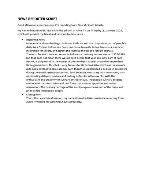 Now, let’s break down those core components of a news reporter script template into actionable sections. First up, we have the INTRO or LEAD . This is your hook, guys! It needs to be concise, punchy, and deliver the most critical information immediately. Think of it as the headline of your verbal report. It should answer the fundamental questions: Who? What? Where? When? Why? And How? Get this right, and you’ve already won half the battle. Following the lead, we move into the BODY . This is where you elaborate on the details introduced in the lead. You’ll provide background information, context, and supporting evidence. This section is crucial for building a comprehensive understanding of the story. Don’t just dump facts; weave them into a narrative. Use transitions to connect different points smoothly, ensuring your report flows logically. VISUAL CUES are also incredibly important here. While not strictly text in your script, you need to note where video footage, graphics, or B-roll will be used. This helps you pace your delivery and ensures the visuals complement your words, not distract from them. Think about what the audience will be seeing while you’re speaking. Next, we integrate SOUNDBITES and QUOTES . These are the voices of your story – interviews with experts, affected individuals, or officials. Choose impactful quotes that add credibility, emotion, or different perspectives. Make sure to introduce who is speaking and their relevance. Proper attribution is key! After presenting the core information and voices, you’ll need a BRIDGE or TRANSITION . This is a short sentence or two that smoothly connects one part of the story to another, or transitions from a soundbite back to your narration. It keeps the report cohesive. Finally, we arrive at the OUTRO or TAG . This is your wrap-up. Summarize the main points, reiterate the most important takeaway, or provide information on what happens next. It’s also where you’ll include your standard sign-off: “This is [Your Name], reporting for [Your News Outlet].” A well-structured script ensures all these elements work together harmoniously, delivering a professional and compelling news report every single time. Remember, practice makes perfect, and a template is your best friend in achieving that perfection.