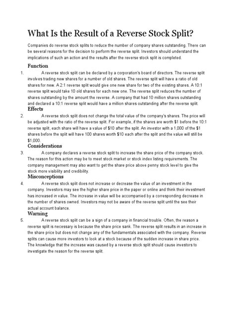 Beyond the strict rules of exchange compliance and attracting institutional funds, a 1-for-2 reverse stock split , or any reverse split for that matter, can be employed by companies with the goal of improving their overall perception in the market. Let’s be honest, guys: there’s a certain psychological element to stock prices. A stock trading at \(0.50 a share often carries a stigma. It's frequently associated with companies that are struggling, speculative ventures, or even on the verge of bankruptcy. This "penny stock" label can deter potential investors, regardless of the company's actual underlying value or future prospects. A higher share price, say \) 10 or $20, can simply feel more substantial, more stable, and more indicative of a healthy, mature business. By consolidating shares and increasing the per-share price, a reverse split aims to shed this negative image and project an aura of greater stability and value. It’s a strategic move to rebrand the stock, presenting it in a more favorable light to the broader investing public. This isn’t just about individual retail investors; it also impacts how financial analysts, media, and even potential business partners view the company. A higher share price can signal a company that is serious, solvent, and poised for growth, even if the fundamentals haven’t drastically changed yet. Furthermore, a company might consider a reverse split to prepare for other corporate actions, such as a merger or acquisition. In such scenarios, a higher share price can make the company look more attractive as an acquisition target or make it easier to negotiate terms. For example, if a company is using its stock as currency in an acquisition, having a higher-priced stock can simplify the transaction and avoid the perception of issuing “cheap” shares. It also often reduces the administrative burden of dealing with a very high number of outstanding shares, which can be a minor but nonetheless real operational benefit. Ultimately, while it’s a cosmetic change, the psychological impact of a higher share price should not be underestimated in the world of finance. It’s about perception management as much as it is about regulatory compliance. Companies hope that by resetting the share price, they can also reset investor sentiment, allowing them to focus on the company’s long-term strategy rather than being fixated on a low, declining share price. This strategic reframing aims to attract a more diverse and stable investor base, which is crucial for any company’s sustained growth and market presence. However, it’s critical for investors to peer beyond this psychological facelift and scrutinize the actual business performance, management’s plans, and the industry outlook. A fancy new dress doesn’t change the underlying structure of the house, and similarly, a reverse stock split doesn’t change a company’s core fundamentals. Therefore, while improved perception is a desired outcome, it must be accompanied by genuine operational improvements to truly add value for shareholders in the long run. Without real progress, the positive perception gained from a reverse split can quickly dissipate, leaving the stock vulnerable to further declines as investors become disillusioned by the lack of tangible results.