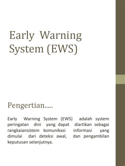 EWS atau Early Warning System , atau dalam Bahasa Indonesianya Sistem Peringatan Dini , adalah sebuah program atau sistem yang dirancang untuk mendeteksi potensi masalah atau bahaya sebelum masalah tersebut berkembang menjadi krisis yang lebih besar. Jadi, bayangin deh, EWS ini kayak alarm yang bisa ngebantu kita buat aware terhadap risiko-risiko yang mungkin terjadi di masa depan. Tujuan utamanya adalah buat ngasih kita waktu yang cukup buat ngambil tindakan pencegahan atau mitigasi, sehingga dampak negatif dari suatu kejadian bisa diminimalisir. Keren kan?