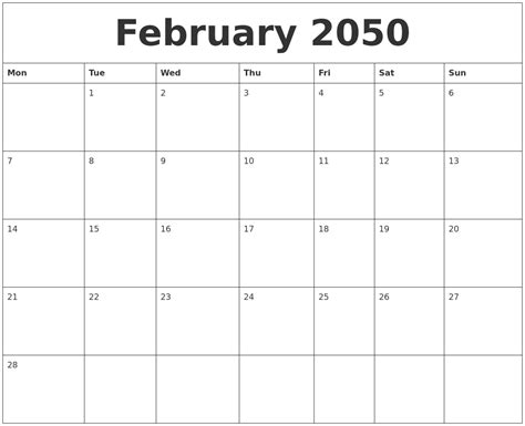 Hey guys! Ready to dive into the future? Let’s take a look at February 2050 . This article is your one-stop shop for everything you need to know about the February 2050 calendar . We’ll cover important dates, potential holidays, and give you some ideas on how to plan your month effectively. So, buckle up and let’s get started on exploring what February 2050 has in store! Planning your schedule in advance is a great way to stay organized and make the most of your time. Whether you’re a student, professional, or just looking to keep track of personal events, having a clear understanding of the February 2050 calendar will be super helpful. Let’s make sure you don’t miss any important birthdays, anniversaries, or other important events. The goal here is to give you a detailed overview, ensuring you can navigate February 2050 with confidence. It’s all about being prepared and making sure you’re ready for anything the month throws your way. This is going to be your go-to guide, so keep reading to get all the details and make the most of February 2050. The February 2050 calendar is right around the corner, so let’s get you ready!