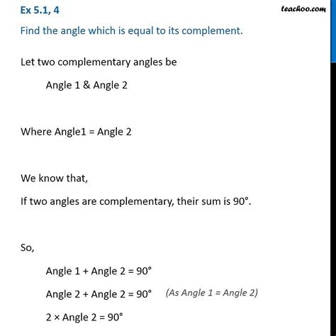 Alright, guys, let’s get to the heart of the matter. The problem states we need to find the angle which is equal to its complement . This means we’re looking for an angle where, if we call it ‘x’, its complement is also ‘x’. Remember our rule from before? Complementary angles add up to 90 degrees. So, if our angle is ‘x’ and its complement is also ‘x’, then their sum must be 90 degrees. This gives us a simple equation: x + x = 90 degrees. See? It’s not so scary after all! We’re essentially looking for a number that, when added to itself, equals 90. This is a fundamental concept in algebra and geometry, and it often pops up in various forms. The beauty of this problem lies in its simplicity and its direct application of definitions. We’re not dealing with complex theorems or obscure postulates; we’re simply using the definition of complementary angles and a basic algebraic equation to find our answer. It’s a perfect example of how understanding the basics can lead to solving seemingly tricky problems. The phrasing itself, “the angle which is equal to its complement,” directly translates into a mathematical relationship, and recognizing this translation is the critical step. Once you see that “equal to its complement” means we have two identical angles that sum to 90, the solution becomes almost self-evident. It’s a little mathematical magic trick, but the trick is all in the definitions and a bit of simple arithmetic. So, let’s dive deeper into solving this equation and uncovering the value of our special angle.