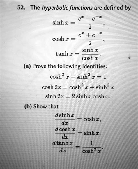 Alright, let’s get down to brass tacks and define hyperbolic functions , particularly the foundational duo: sinh(x) and cosh(x) . Unlike your everyday sine and cosine functions that are intrinsically tied to the unit circle (remember SOH CAH TOA?), hyperbolic functions get their name because they’re based on the hyperbola . But wait, there’s an even more fundamental way to look at them: they’re defined using the exponential function , e^x. This connection is super important and actually makes them a lot easier to work with once you get the hang of it. Think of ‘e’ as Euler’s number, approximately 2.71828, a cornerstone of calculus and natural growth.