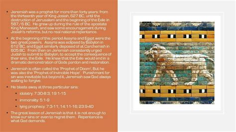 Understanding the history is crucial. Judah was in a state of spiritual decline. They had turned away from God, worshipping idols and engaging in social injustice. The covenant with God, established through Moses, was being broken. Jeremiah’s role was to call the people back to faithfulness, warning them of the consequences of their actions. He prophesied about the impending Babylonian invasion and the destruction of Jerusalem if they didn’t repent. The kings and the people largely ignored his warnings, leading to the tragic events of 586 BC when Jerusalem fell to Babylon, and many were taken into exile. This historical context frames Jeremiah’s messages of judgment and hope, making them deeply relevant to his audience and to us today.