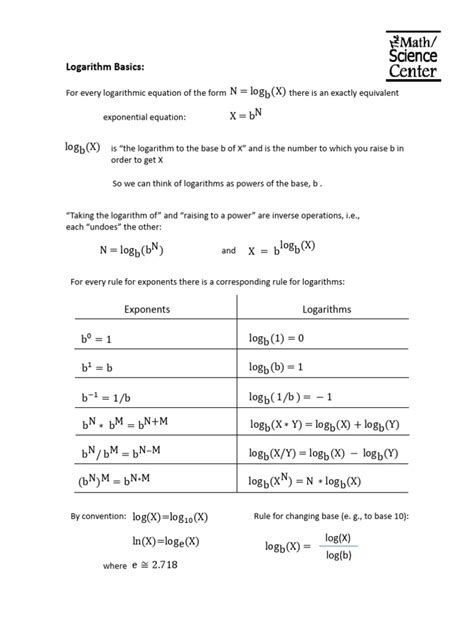 4. Change of Base Formula: \(\log_b(M) = \frac{\log_c(M)}{\log_c(b)}\) . This is crucial when you need to calculate a logarithm with a base that your calculator doesn’t have directly. You can convert it to a common log (base 10) or natural log (base \(e\) ). For example, to find \(\log_2(3)\) , you could calculate \(\frac{\log_{10}(3)}{\log_{10}(2)}\) or \(\frac{\ln(3)}{\ln(2)}\) .