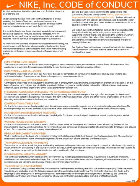 Hey guys! Ever wondered what goes on behind the scenes at a giant like Nike? You know, the company that makes all those awesome sneakers and athletic gear? Well, a huge part of that is their Nike Code of Conduct . It’s basically their rulebook for how everyone associated with Nike, from their own employees to the folks who make their products, should act. Think of it as the ultimate guide to doing things the right way, ensuring fairness, safety, and ethical practices across the board. This isn’t just some dusty document; it’s a living, breathing set of principles that Nike uses to steer its massive global operations. It covers everything from how workers should be treated to environmental responsibilities and even how Nike employees themselves should behave. So, if you’re curious about the backbone of Nike’s operations and what standards they hold themselves and their partners to, you’ve come to the right place. We’re going to break down what the Nike Code of Conduct is all about, why it’s so important, and what it means for everyone involved.