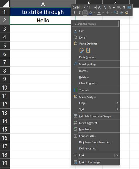 Here’s another speedy option for you: the Mini Toolbar! After you select the cell(s) you want to format, just move your mouse cursor over the selected area. A semi-transparent toolbar, the Mini Toolbar, will pop up. If it doesn’t appear immediately, don’t fret; just move your mouse slightly over the selection, and it should show up. This little guy gives you quick access to common formatting options, including font styles, sizes, and colors. Now, look closely at the Mini Toolbar. You might see the strikethrough option directly there. If you do, awesome! Just click it. If it’s not immediately visible, you might need to click the small arrow on the right side of the Mini Toolbar to expand it and reveal more options. Once you find the strikethrough icon (it usually looks like a letter ’S’ with a line through it), click it. Your text will be struck through! This is one of the quickest ways if the option is readily available on the toolbar. It’s designed for speed, letting you format on the fly without having to go into a separate dialog box or menu. Super handy for those quick edits!