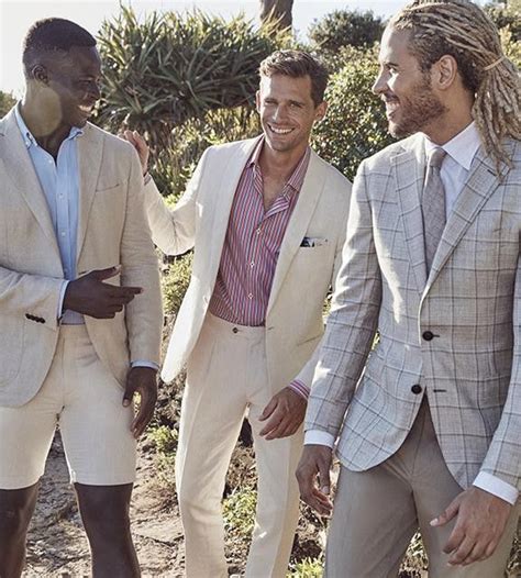 Summer weddings are where comfort meets style in the heat. The key word here is breathability . Your wedding outfit for men needs to keep you cool while looking sharp. Linen suits are the undisputed champions of summer weddings. They offer a relaxed yet undeniably stylish vibe and are incredibly breathable. If pure linen feels too prone to wrinkles, a linen-cotton blend or a lightweight tropical wool is a great alternative. Color-wise, embrace lighter shades : khaki, stone, light grey, pale blue, and even bolder colors like coral or teal can work beautifully, especially for destination or beach weddings. Short-sleeved shirts or breathable cotton shirts are suitable for more casual summer ceremonies. If a suit feels too formal, consider smart separates – a well-fitting blazer paired with chinos or tailored shorts (if the dress code permits). For footwear, espadrilles, loafers (worn sockless!), or boat shoes are excellent choices. Avoid heavy, dark fabrics and overly formal attire unless the dress code specifically calls for it. Your wedding outfit for men in summer should feel effortless and cool.