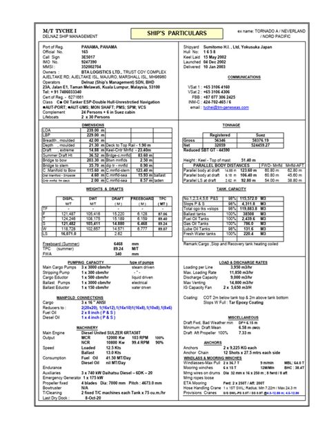 This is the bread and butter for cargo ships, guys! The Ship’s Particulars will extensively detail everything related to what the vessel can carry. For a tanker, this means cargo tank capacities , pump rates , and number of segregations . For a bulker, it’s about number of cargo holds , hold dimensions , grain and bale capacities , and crucially, the number and type of cargo gear (like cranes, their lifting capacity, and outreach). For container ships, it’s about TEU (Twenty-foot Equivalent Unit) capacity and reefer plug availability . Specific details like deck strength and hatch dimensions are also important for loading particular types of cargo. This section directly dictates the type and volume of cargo a vessel can transport, making it indispensable for logistics and supply chain planning. Accurate information here prevents overloading, ensures cargo safety, and optimizes loading/unloading operations, directly impacting profitability and operational efficiency. It’s the information that ensures your goods get from A to B safely and efficiently.